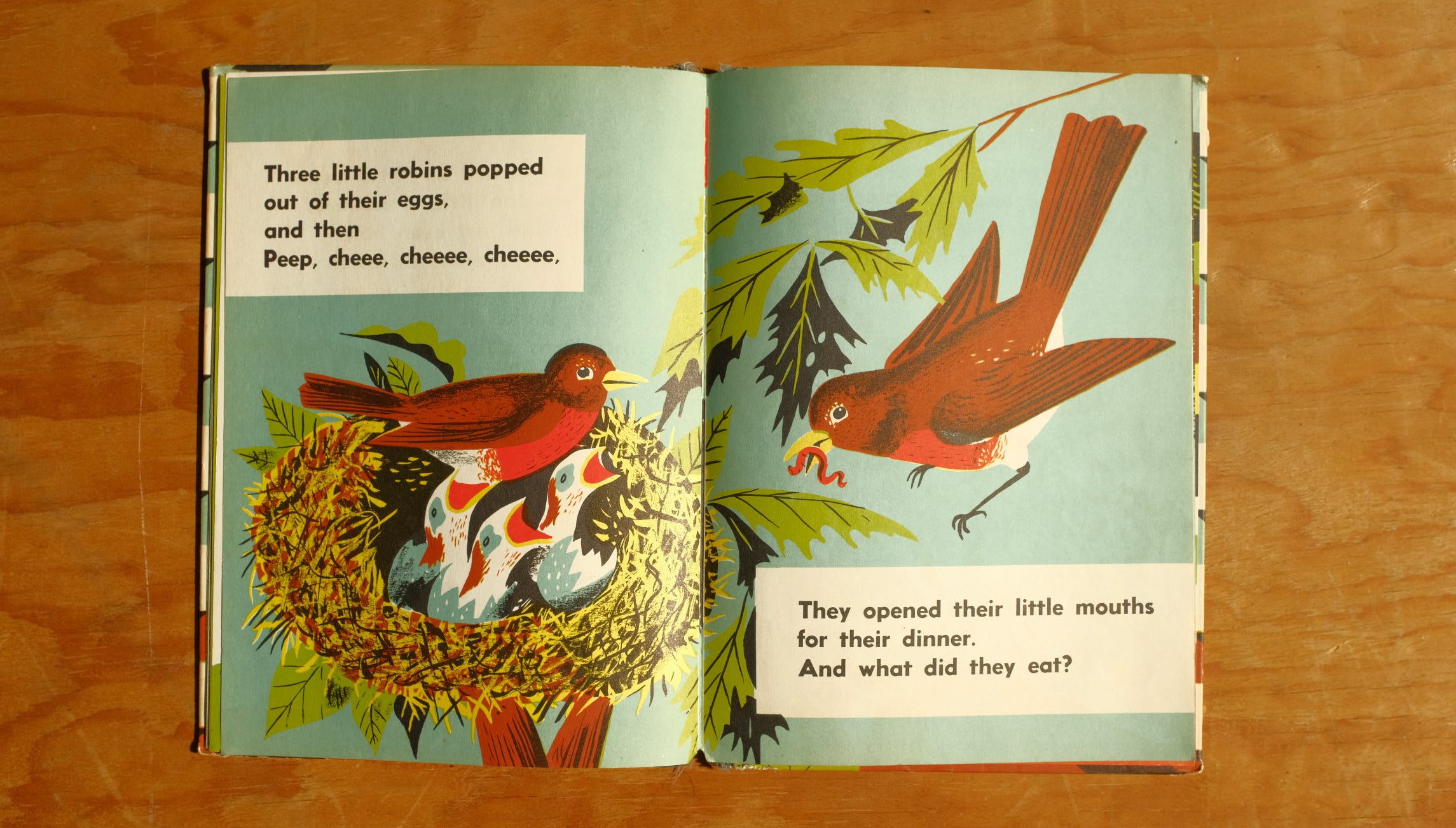 The Summer Noisy Book is part of Brown and Weisgard’s cacaphonous, mind-bending Noisy Book series. The Noisy Books all follow the same pattern, roughly, kind of, but not really at all, because this is Margaret Wise Brown and she is going to do as she pleases. But basically here’s how they work — there’s a dog, Muffin, who hears all sorts of noises, conveyed by Brown with energetic and often surprising onomatopoeia. (These books give the adult reading aloud a real vocal workout.) The text asks children to guess what’s making each sound. Brown asks other, knottier questions too: What are those baby birds eating for dinner? Can Muffin hear a wild geranium bloom? Unlike many guessing books, The Summer Noisy Book is full of surprises.
