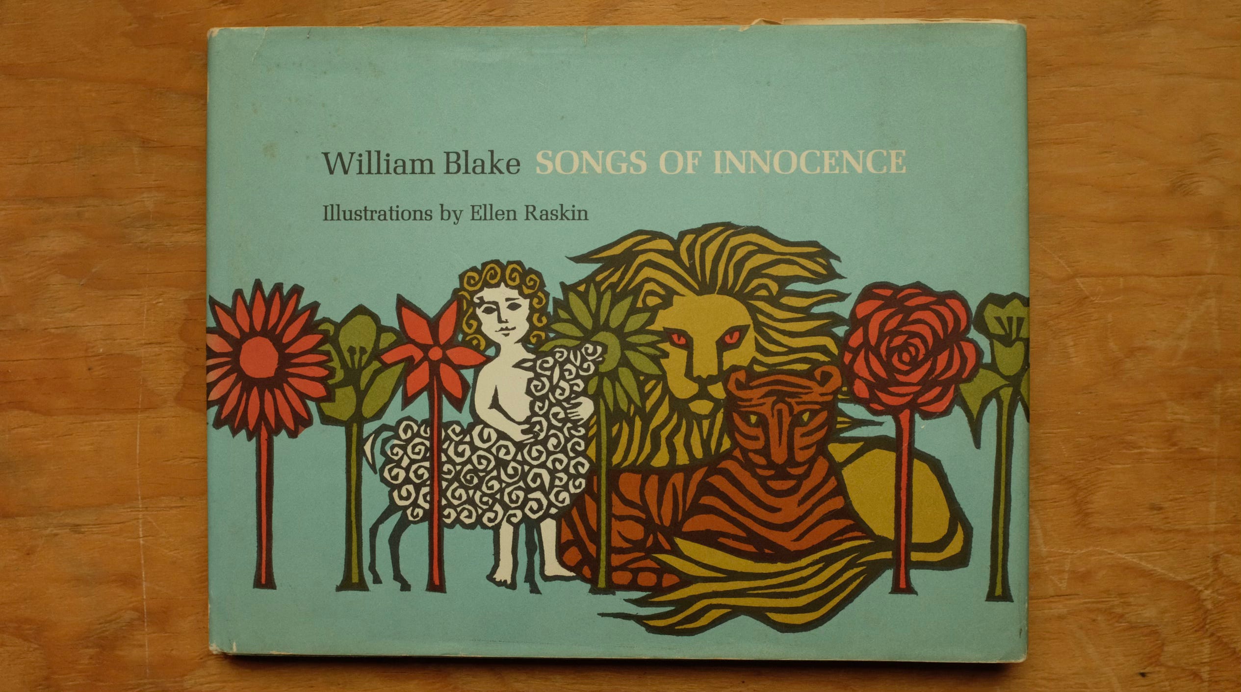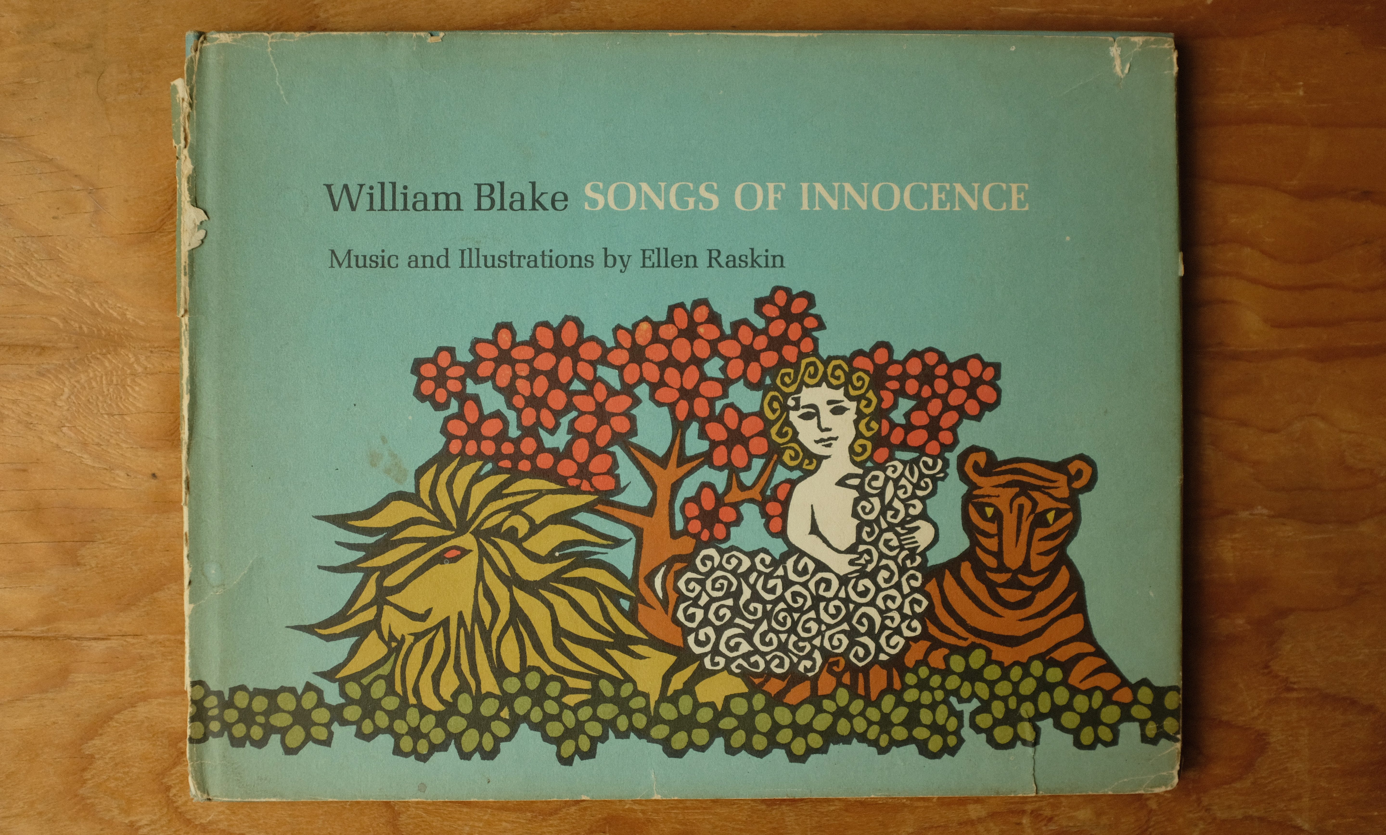 Anyway, sorry, back to that cover! This is a strange and fascinating picture book, setting Blake’s poems to music, arranged for piano and guitar by Raskin; the sheet music is accompanied by woodcut illustrations. From Raskin: “The melodies I have written for the poems seek to interpret them musically, and my decorations seek to interpret them graphically.” There is another volume, just the poems and pictures, with a slightly different cover. Strange!