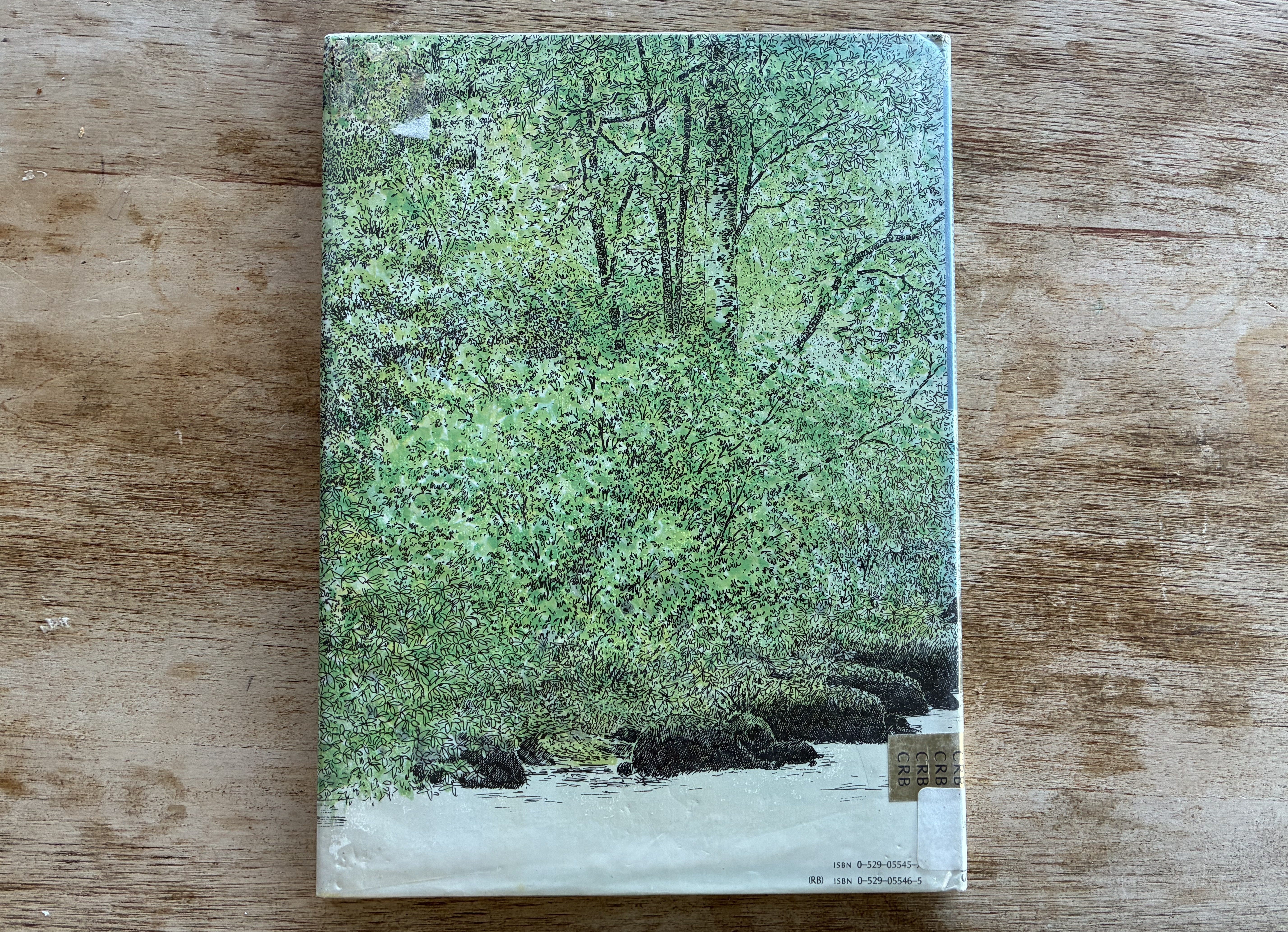 My posting of this cover comes with a question to our readers: Are there any animals on it? The premise of this wordless book is that there are animals in the forest drawings, but the animals are hidden. They are not literal animals — they are outlined in the rendering style. They’re silhouetted in the spaces between the leaves, or the way a collection of rocks is shaped, etc. For instance, on the back cover is this rabbit in one of the rocks in the stream: