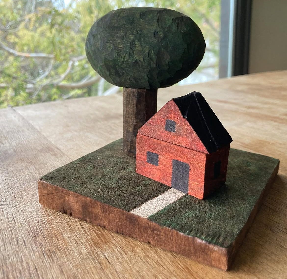 Here’s a red house under a tree.