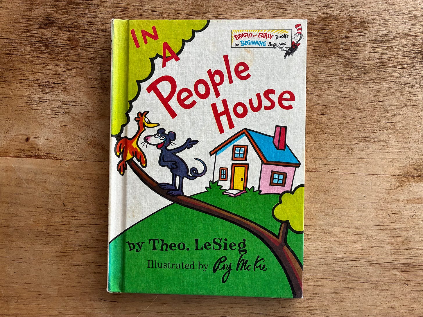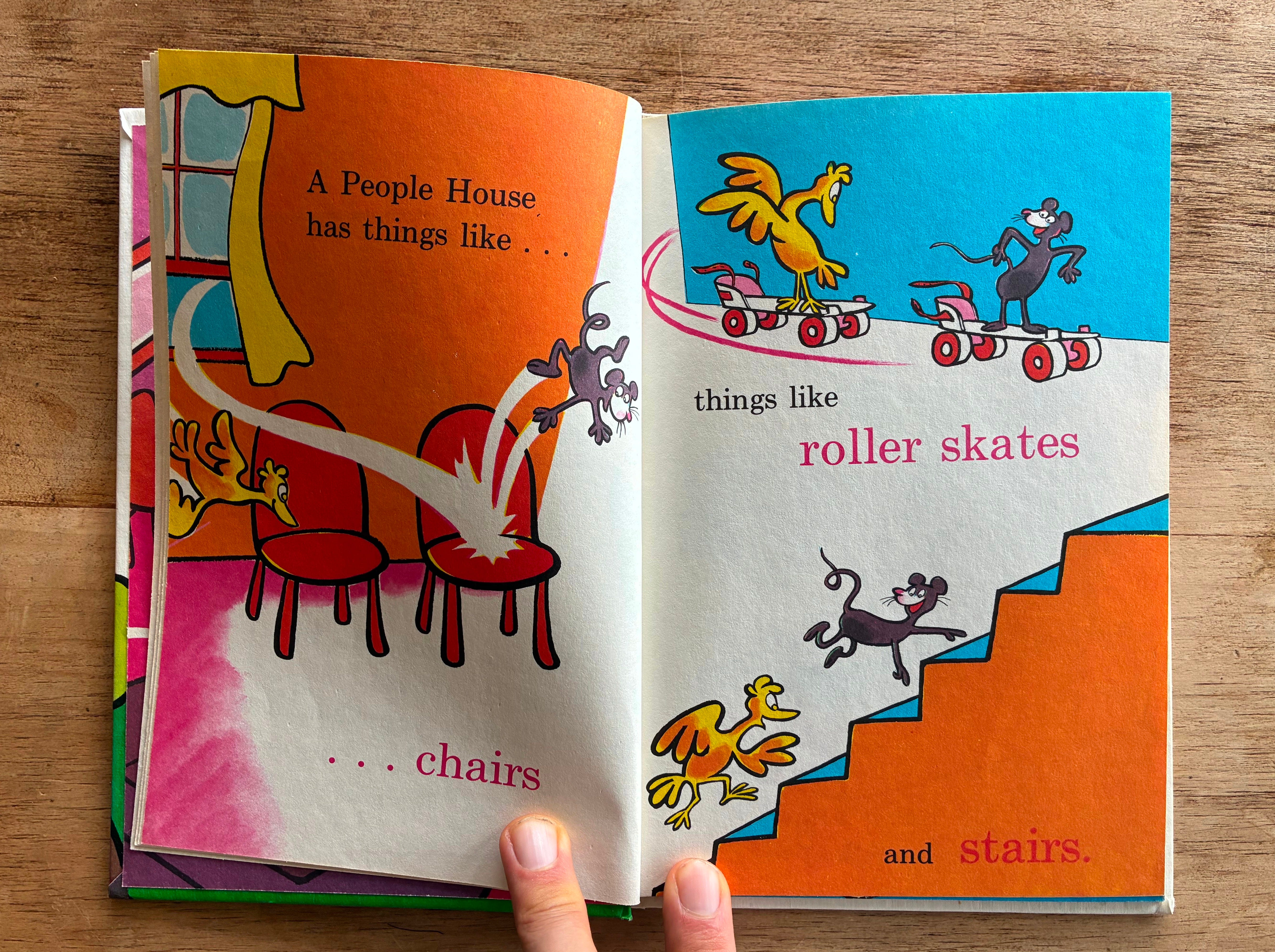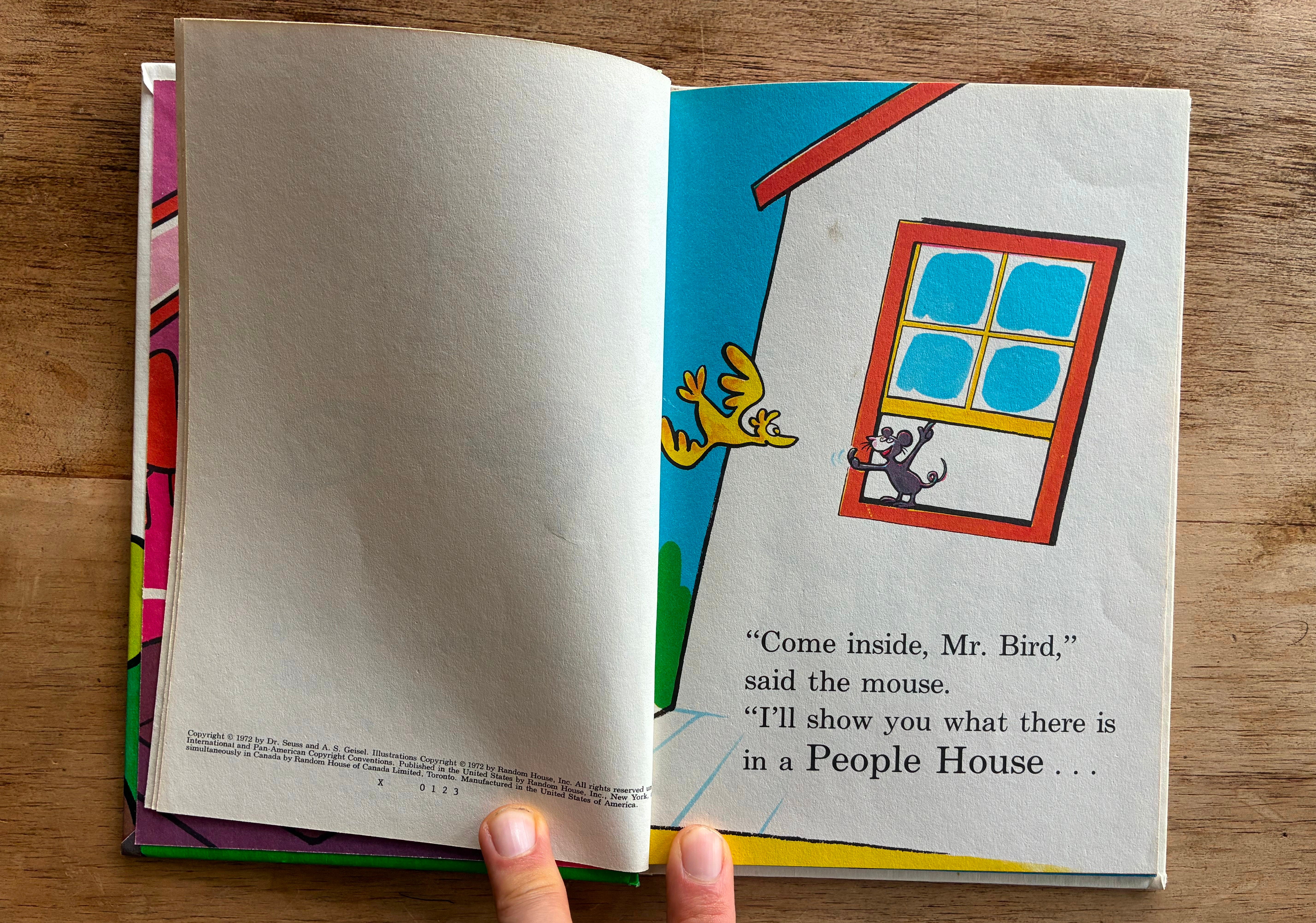 In A People House is, in some ways, also a book about permission. Theo LeSieg gets to write a book that mostly just lists things that are in a house, but he has a conceit that gives this exercise some interest and tension. A bird and a mouse have snuck in through an open window, and the mouse knows the names of things in there, and he’s going to teach the bird what they are.