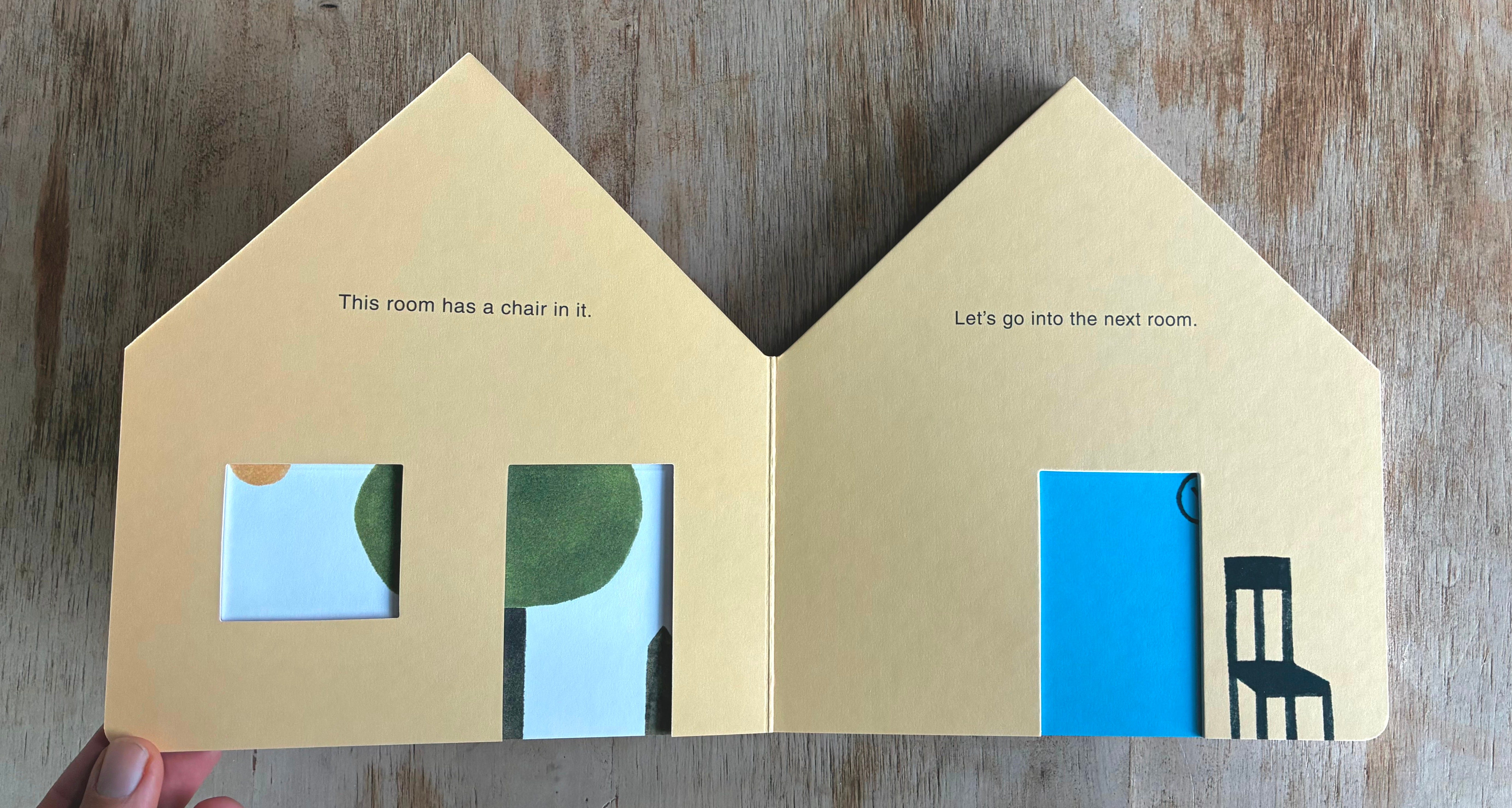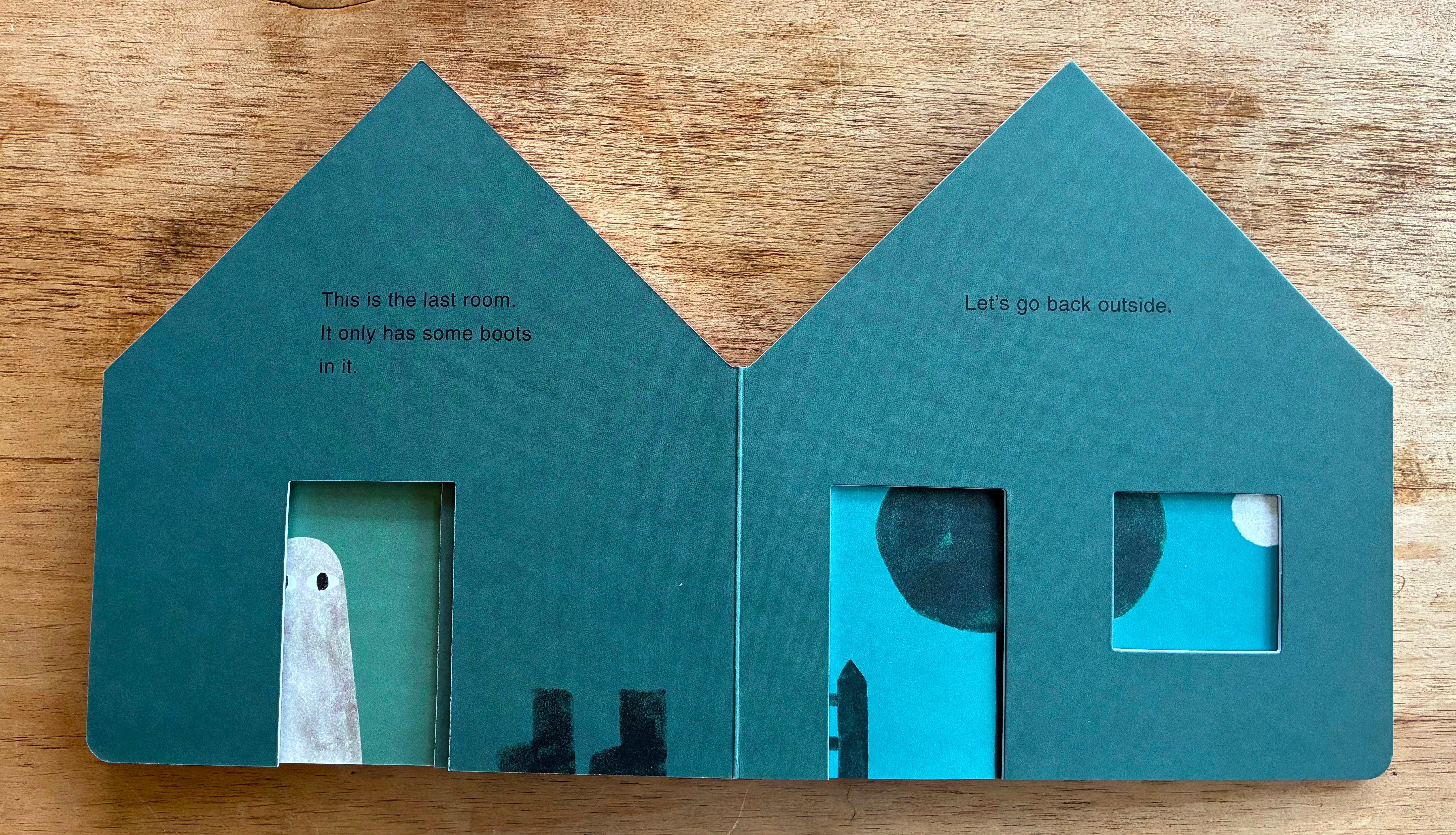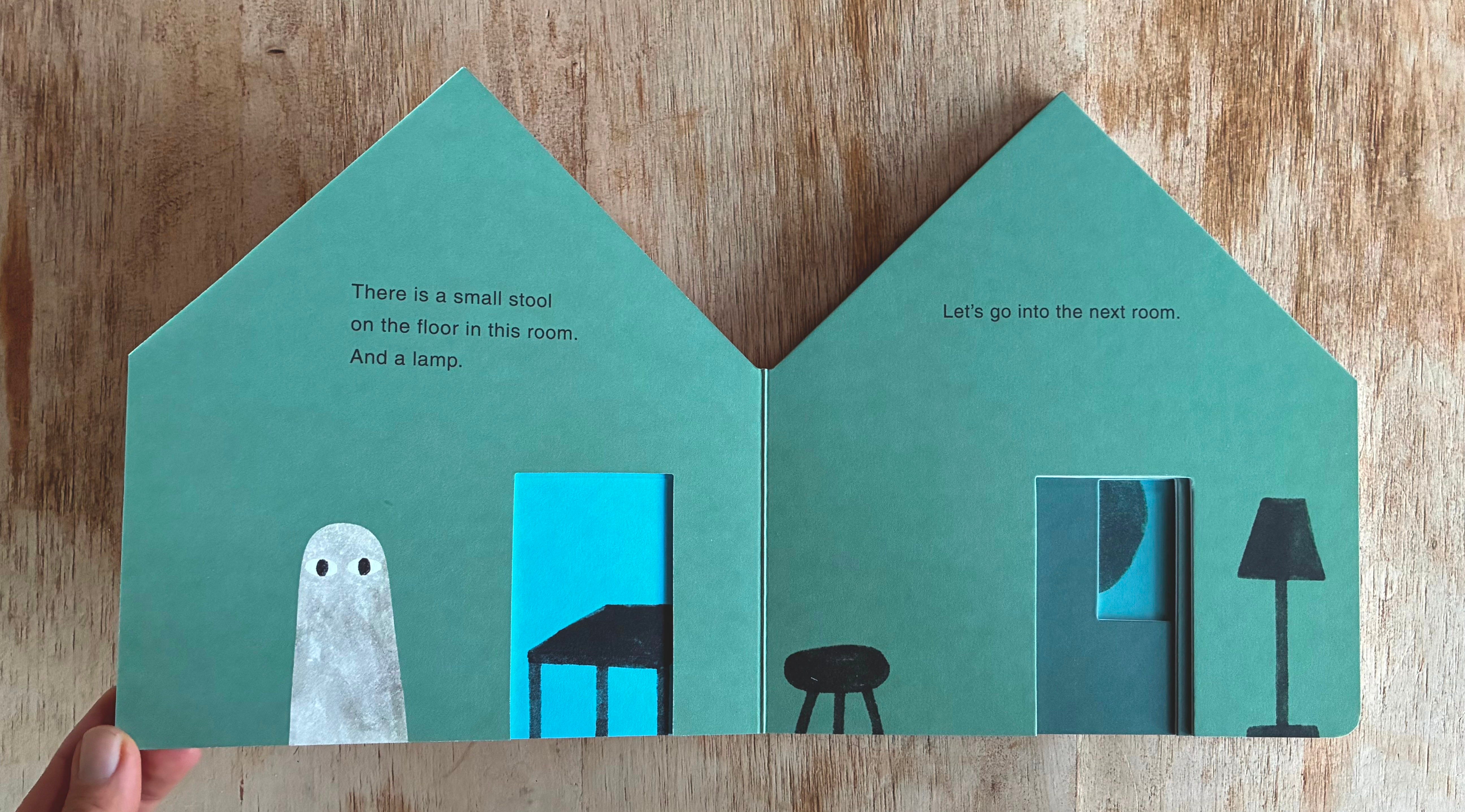 My getting into board books and making little wooden toyish areas feels very connected. The board books, so far, have been about assembling a series of components that make up a place — a farm, an island, a forest — like a little toy set. When the place feels complete, all the pieces go to sleep (and close their eyes), and the book is over. But also, board books, as objects themselves, FEEL more like toys to me than books. They are like blocks. They are solid, sturdy things. And you can cut them into shapes of other things and they hold that shape very well. Almost as soon as I started making board books I started to think about making a house-shaped one. And the idea of treating it almost as a toy of a house, with a cut-out front door, and doors inside that door, moving through the book from room to room, like our Roy McKie endpaper-doors up there, felt exciting. I liked the idea of just a house-shaped book that listed things in that house. But that’s a little too dry, right? It needed a permission slip, some kind of tension, like the trespassing-mouse-and-bird idea. What I decided on was that the book really was going to ACT and LOOK like a straightforward object-listing book — simple shapes, primary colors, clear typeface. It thinks its job is to list things in a house. It doesn’t believe in ghosts, and probably it can’t even see them.