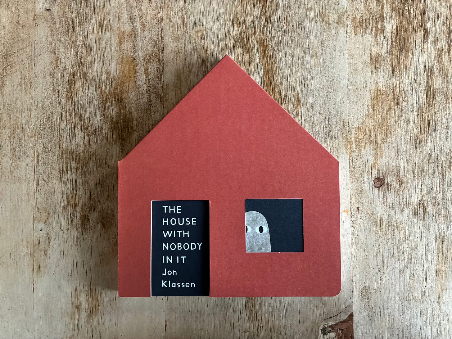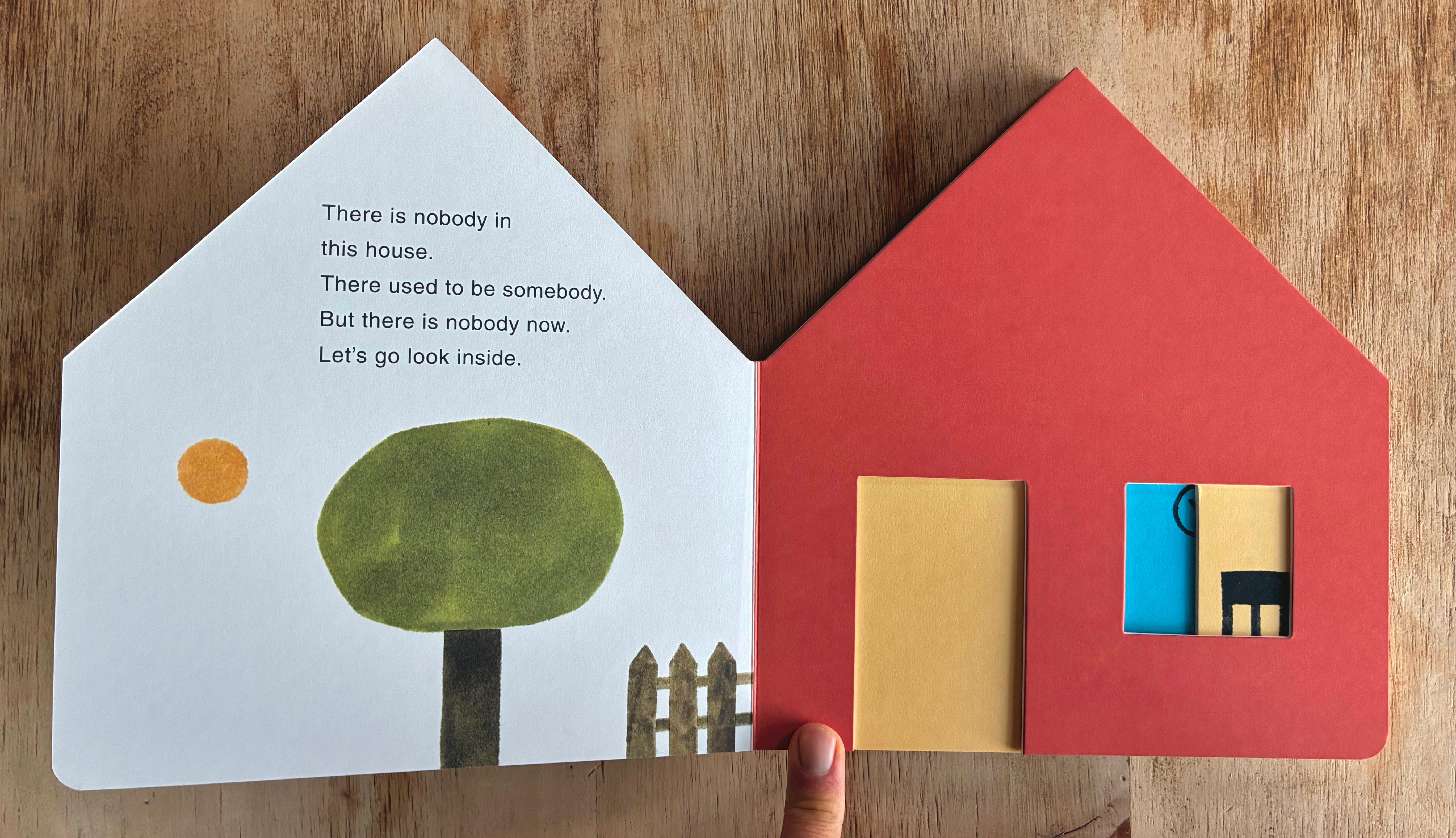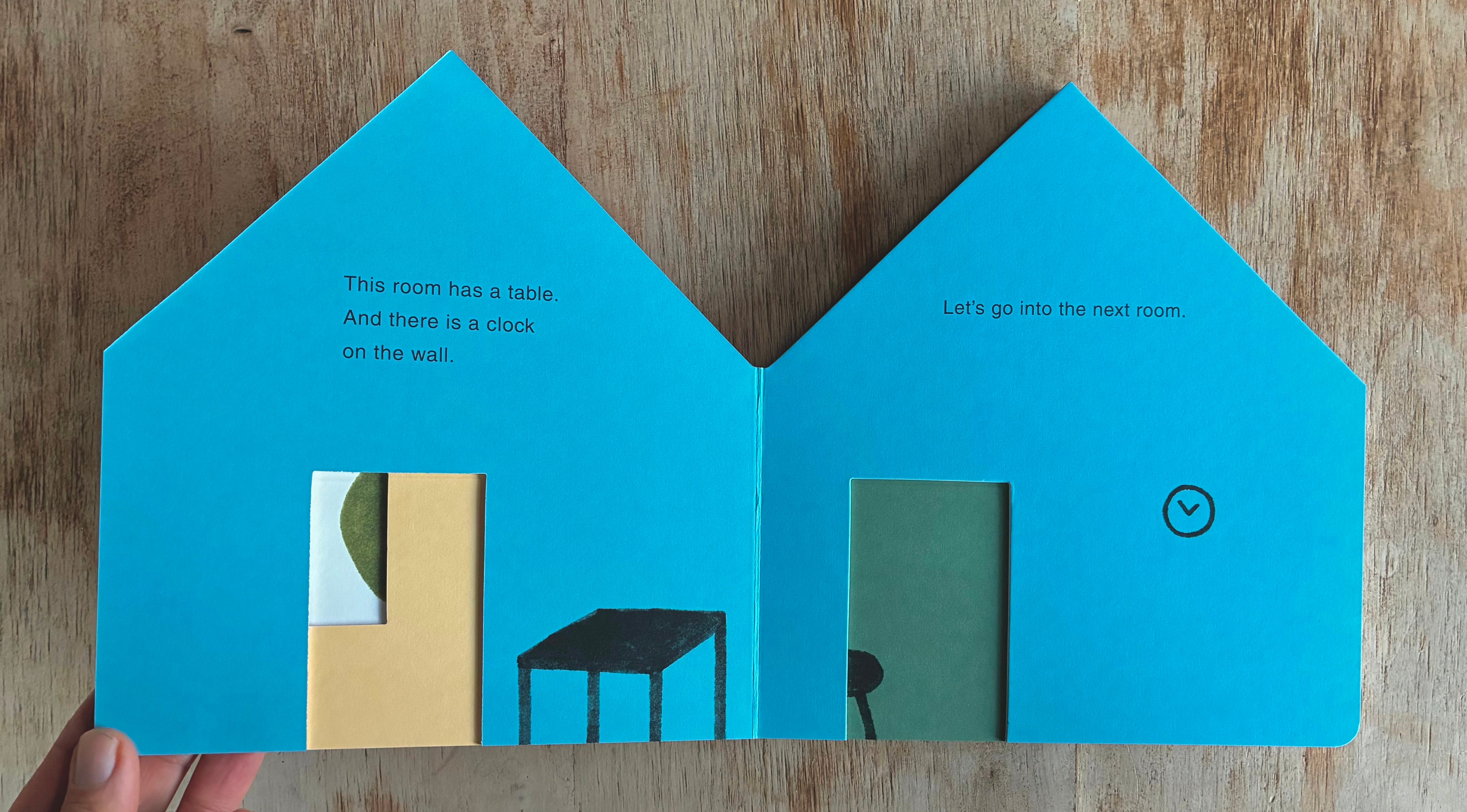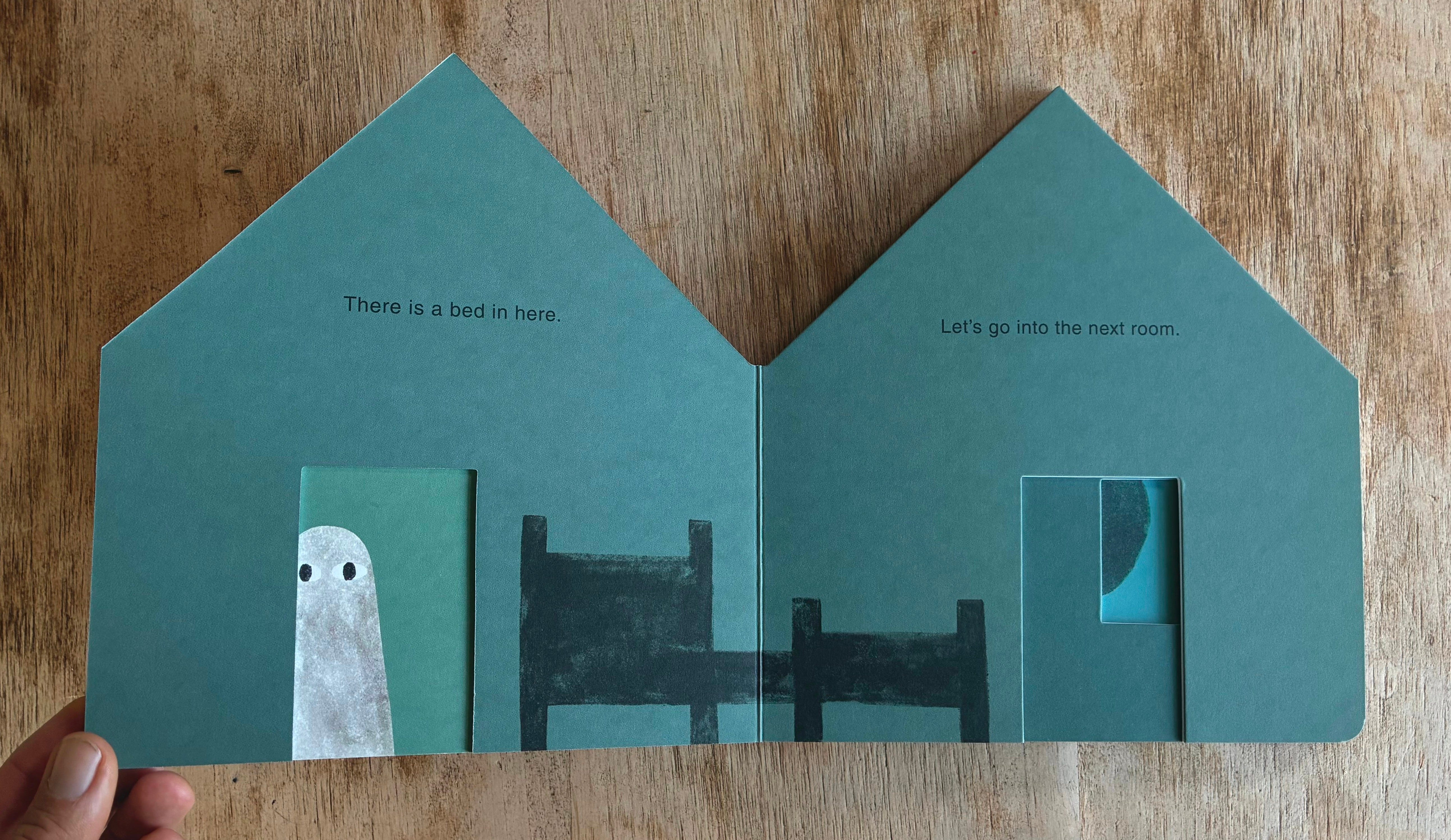 My getting into board books and making little wooden toyish areas feels very connected. The board books, so far, have been about assembling a series of components that make up a place — a farm, an island, a forest — like a little toy set. When the place feels complete, all the pieces go to sleep (and close their eyes), and the book is over. But also, board books, as objects themselves, FEEL more like toys to me than books. They are like blocks. They are solid, sturdy things. And you can cut them into shapes of other things and they hold that shape very well. Almost as soon as I started making board books I started to think about making a house-shaped one. And the idea of treating it almost as a toy of a house, with a cut-out front door, and doors inside that door, moving through the book from room to room, like our Roy McKie endpaper-doors up there, felt exciting. I liked the idea of just a house-shaped book that listed things in that house. But that’s a little too dry, right? It needed a permission slip, some kind of tension, like the trespassing-mouse-and-bird idea. What I decided on was that the book really was going to ACT and LOOK like a straightforward object-listing book — simple shapes, primary colors, clear typeface. It thinks its job is to list things in a house. It doesn’t believe in ghosts, and probably it can’t even see them.