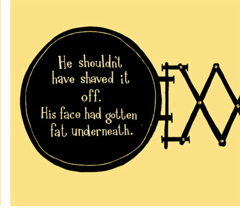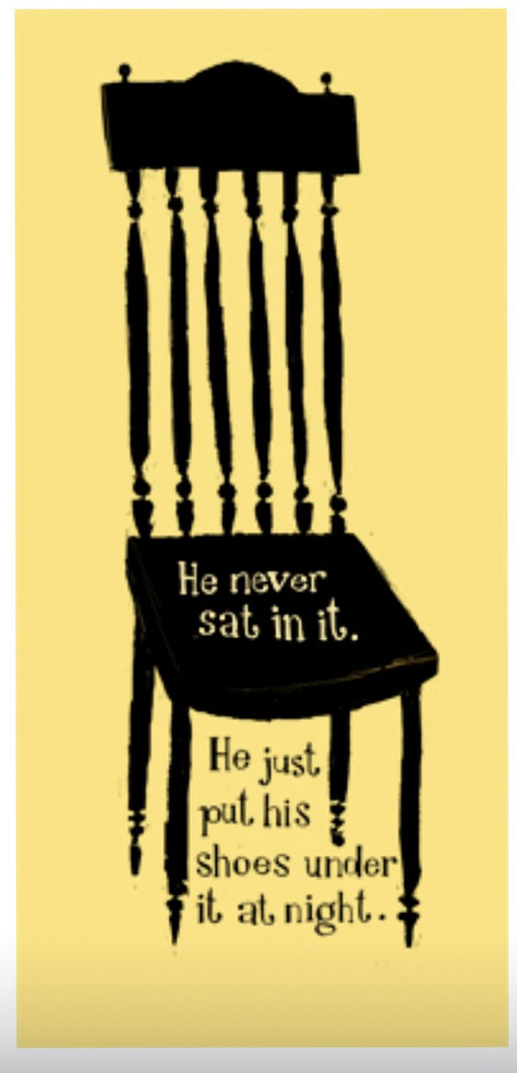 So, after all this set up, all these disparate things all collected, fifteen-odd years later, I got to put a black chair, without eyes, in a yellow room, just like those early images I sent to my agent. I got permission for this to be a page in a book, and it truly is one of my favorite pages of any book I’ve done, because of everything that needed to surround it to make it happen.