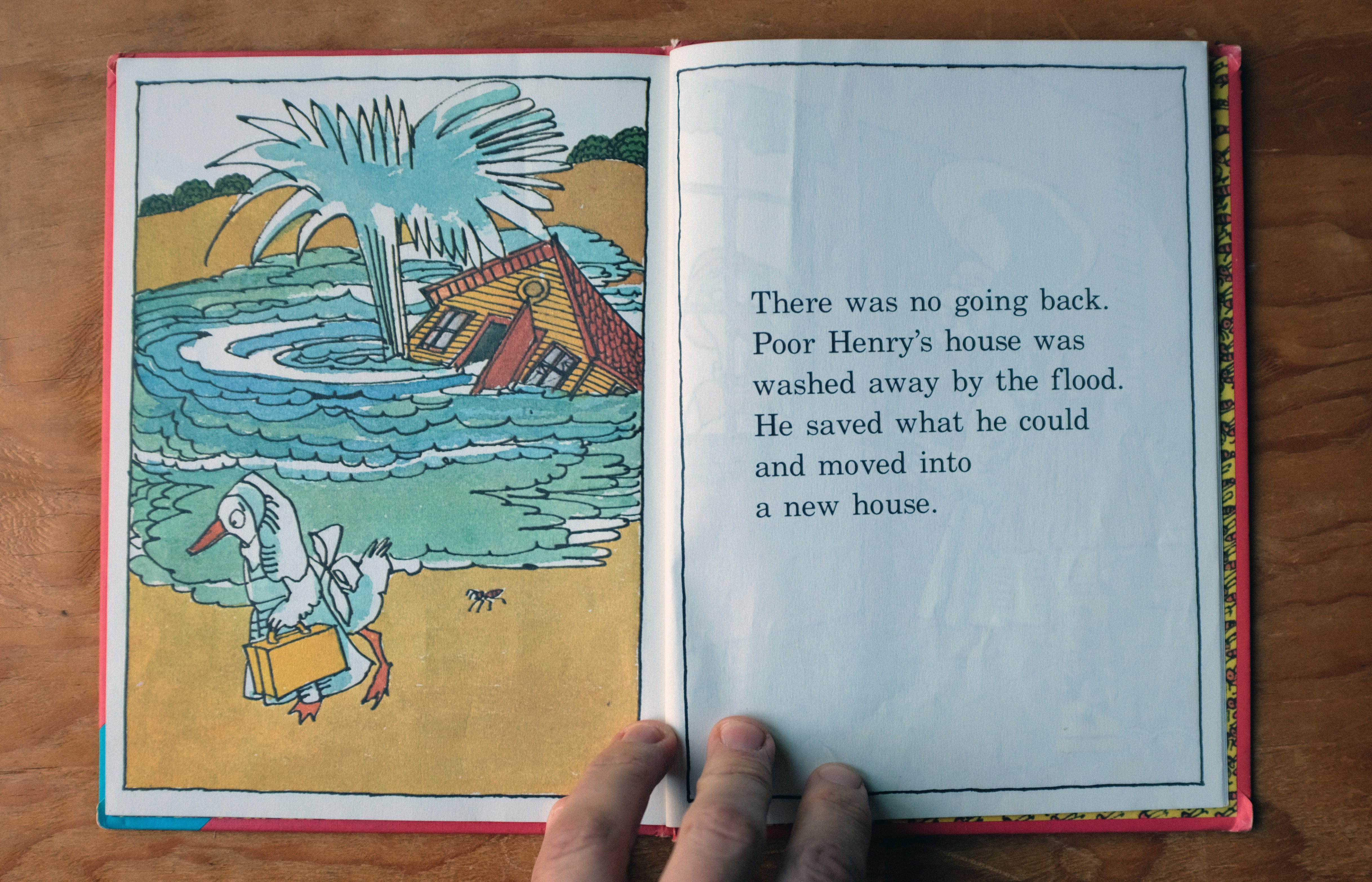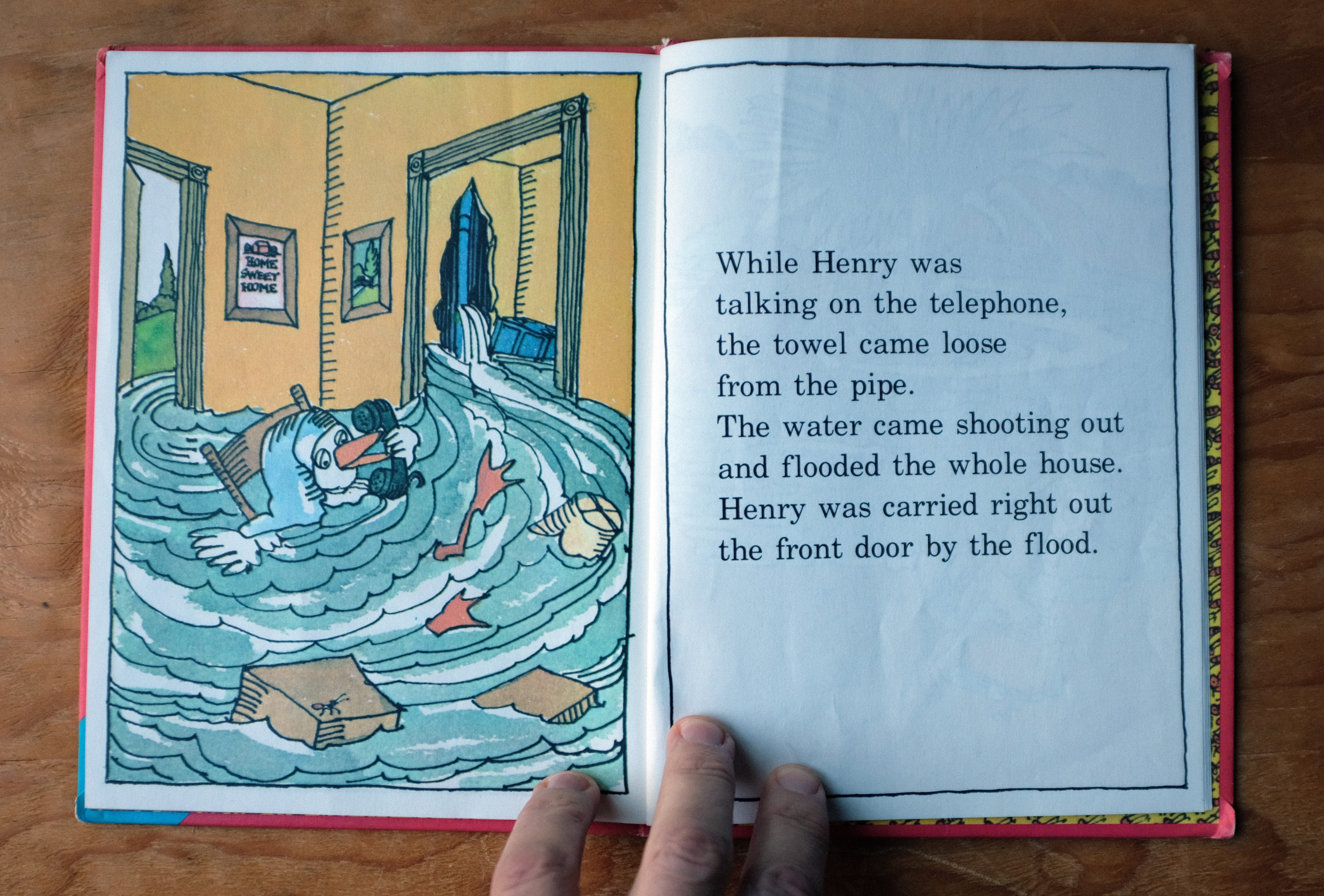 Things, as always, work out poorly for Henry. The book is beautifully structured. Every page turn is an escalation of Henry’s misery. Quackenbush lays out every spread the same way. An illustration on the verso, text on the recto, both set in frames. This formal design serves the comedy well. Quackenbush often repeats compositions, which give the page turns a flipbook quality, allowing him to pull off slapstick and physical gags that you’d think would be better suited to animation than picture books.