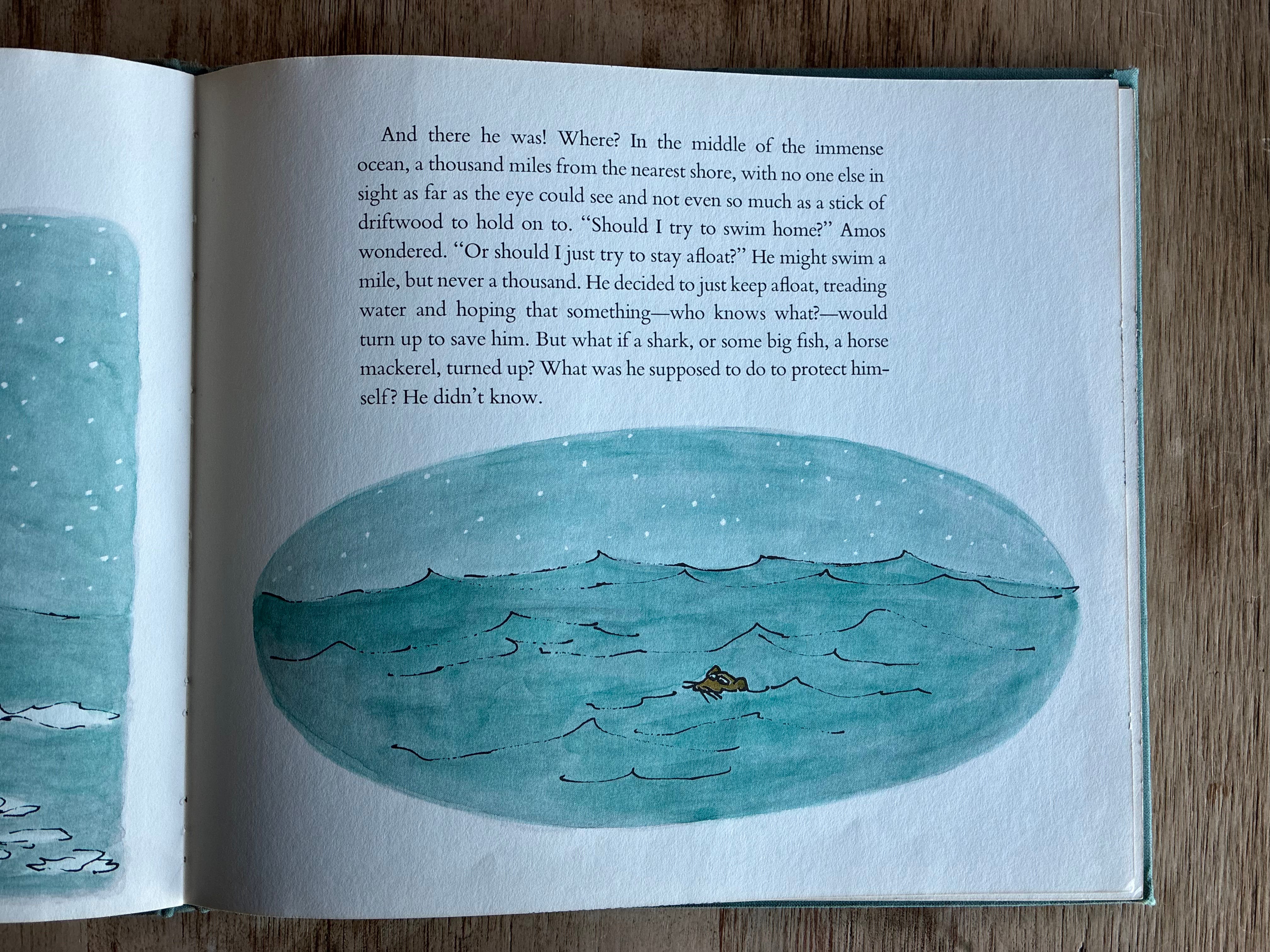 “He never saw it again”??? One page ago, he was lying under a blanket of stars, whales going by, nothing in the WHOLE BOOK had gone wrong. Amos loves the ocean, he builds a boat, boat works beautifully, he has years of supplies. Everything has gone so well that he is literally tripping out on his deck about it, and one page later he’s in the water, boat is a few feet away and, we are told, in the text, he is going to just watch it float off until it’s gone forever.
