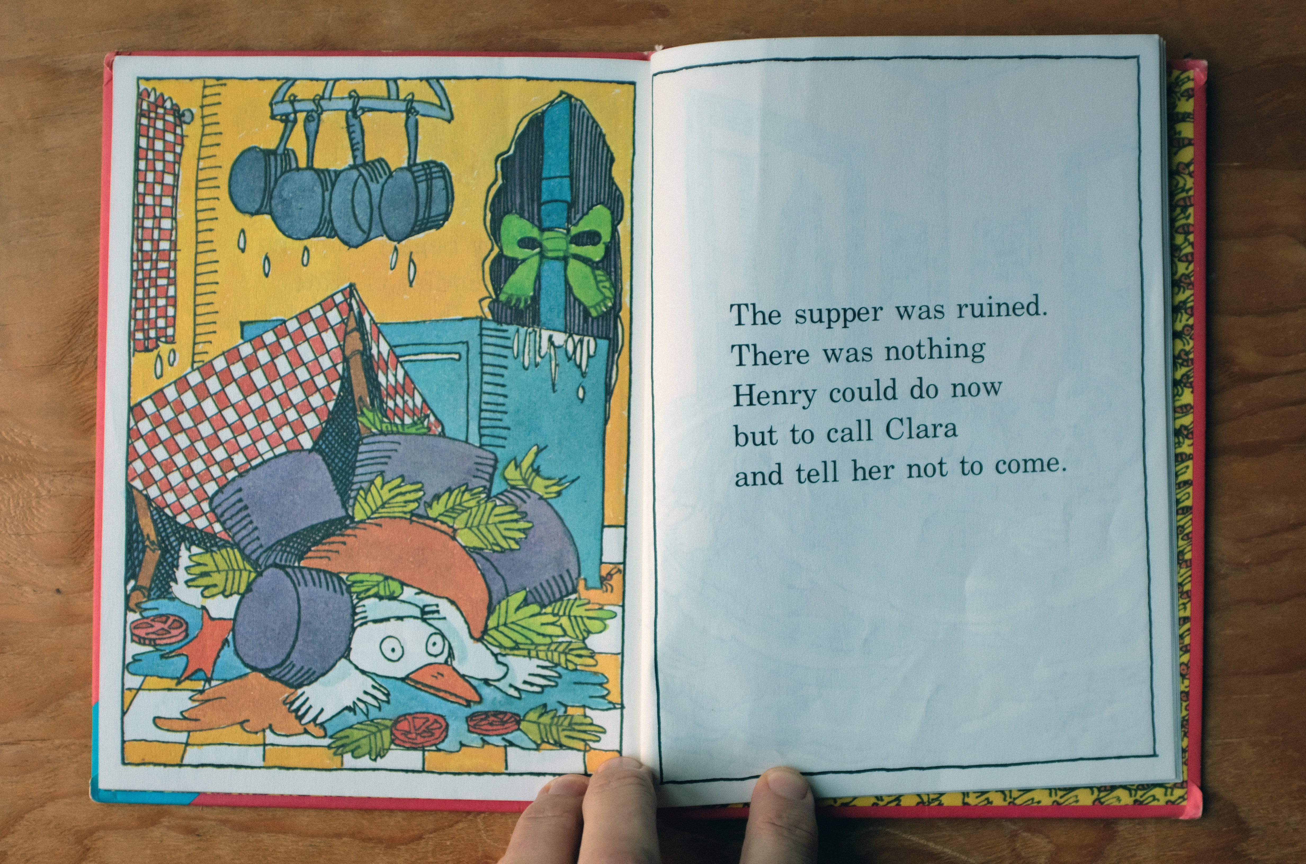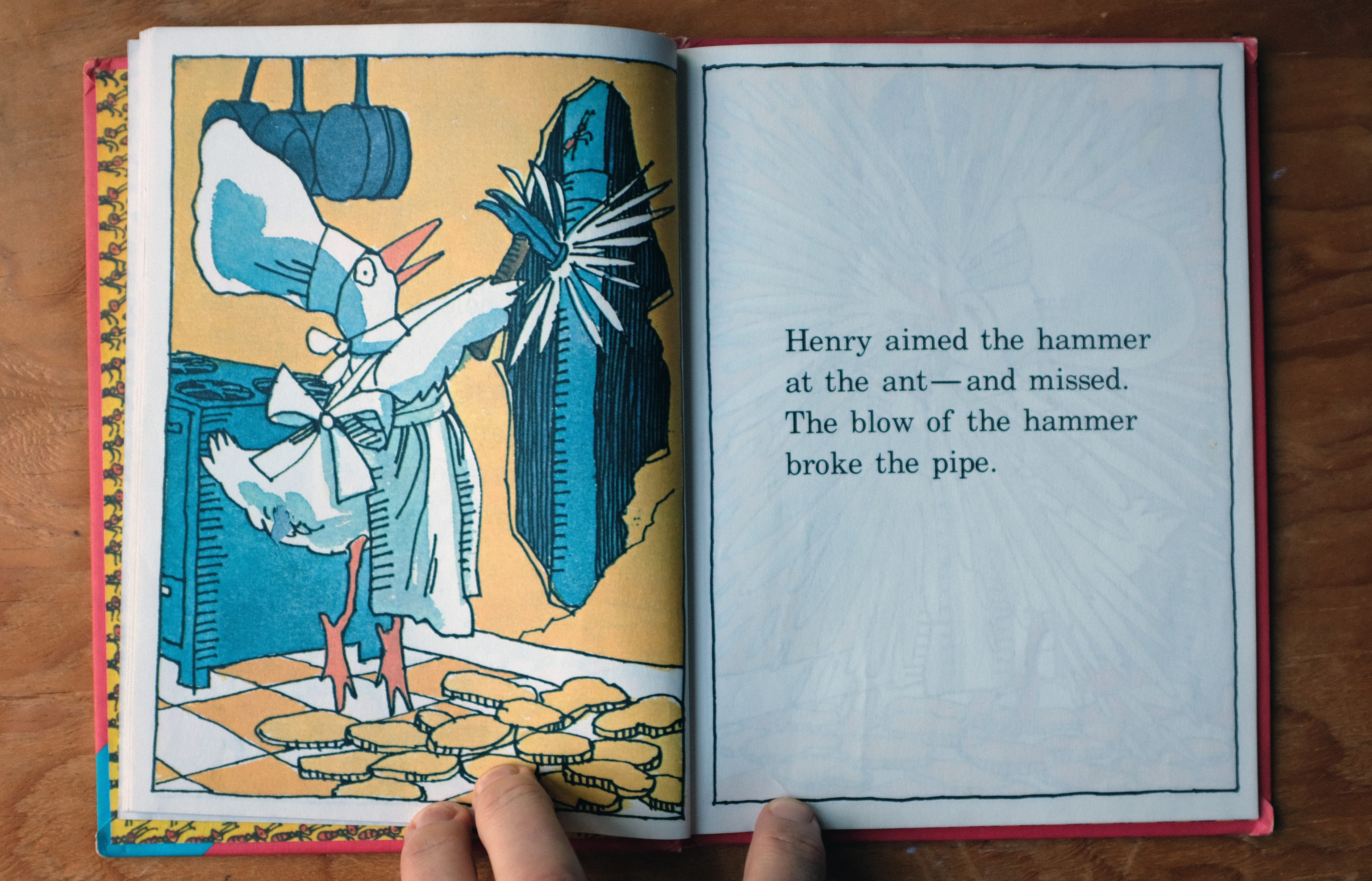 In Henry’s Awful Mistake — part of Robert Quackenbush’s series about a hapless, lovelorn duck — Henry spots an ant in his kitchen while cooking dinner for his “friend” Clara. Worried that Clara “might think his house was not clean,” Henry is resolute: “The ant had to go.”