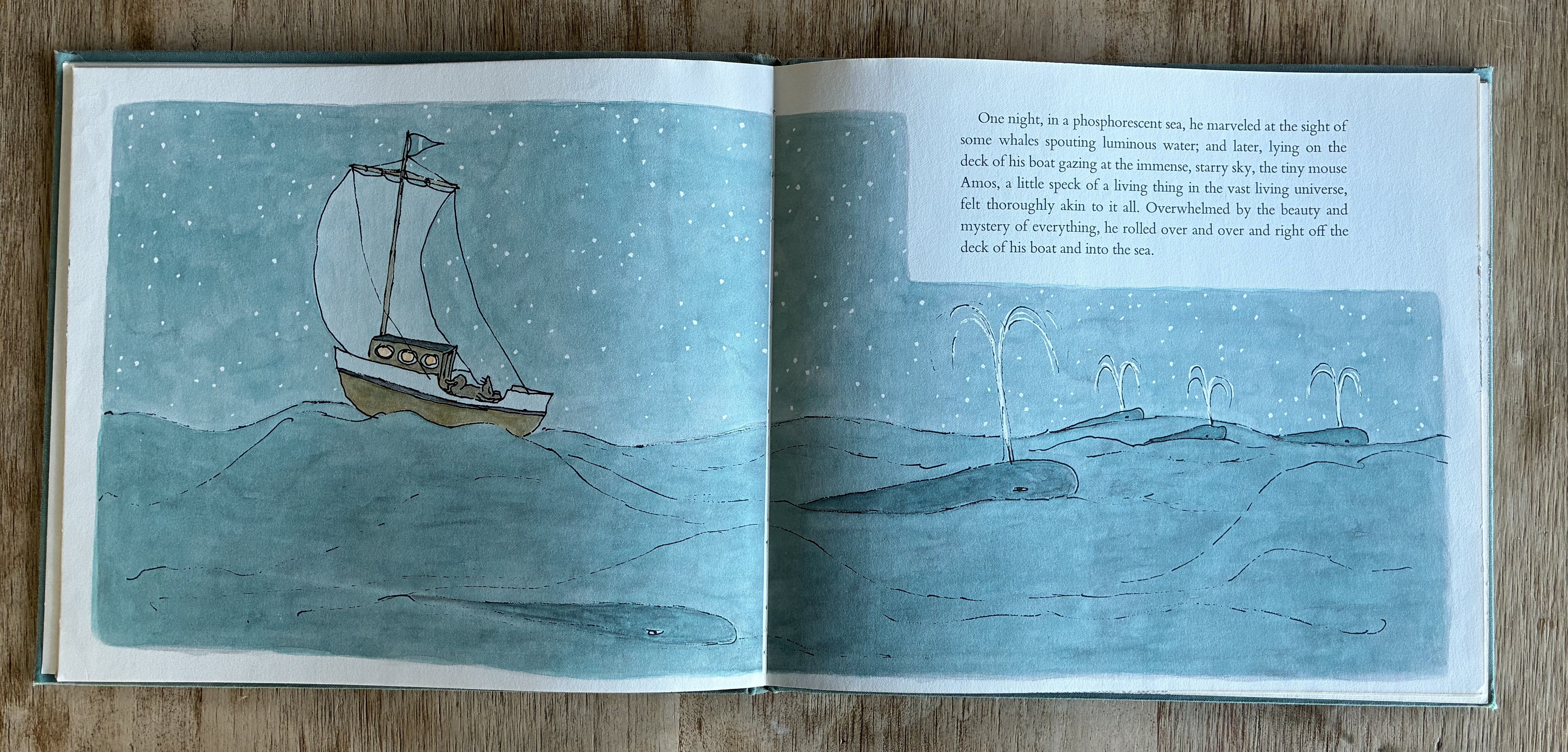 The day of the launch arrives and everything goes beautifully. Time gently speeds up and we are pleasantly crossing sunny days on the boat with Amos. The text goes from describing straight events into something more contemplative about Amos’ state of mind, in a way only Steig knows how to do. He continues this tone on the next page, showing us the night version of the mood he’s established, where we see Amos asleep on his gently rocking boat with whales going by dreamily in the dark.
