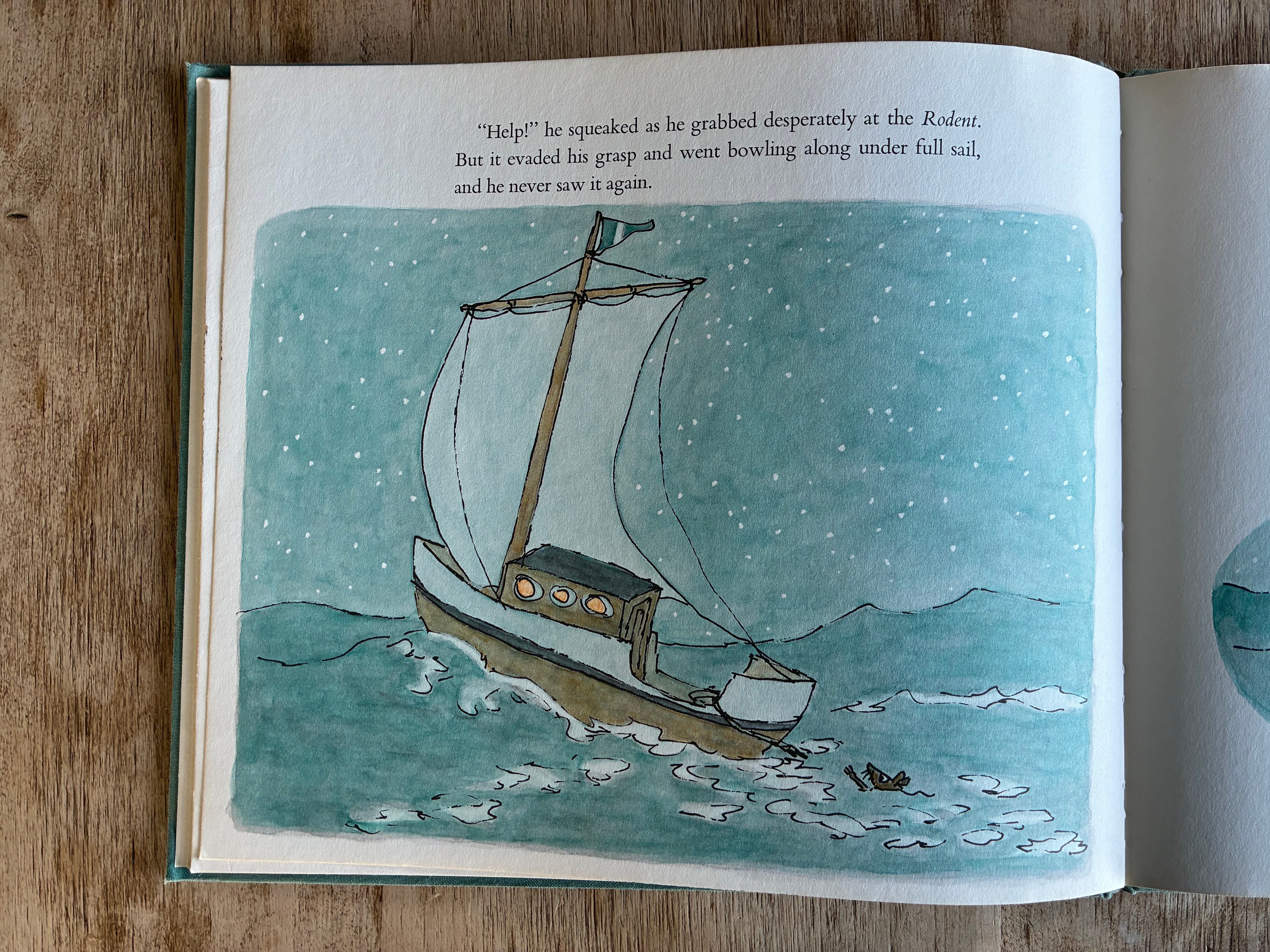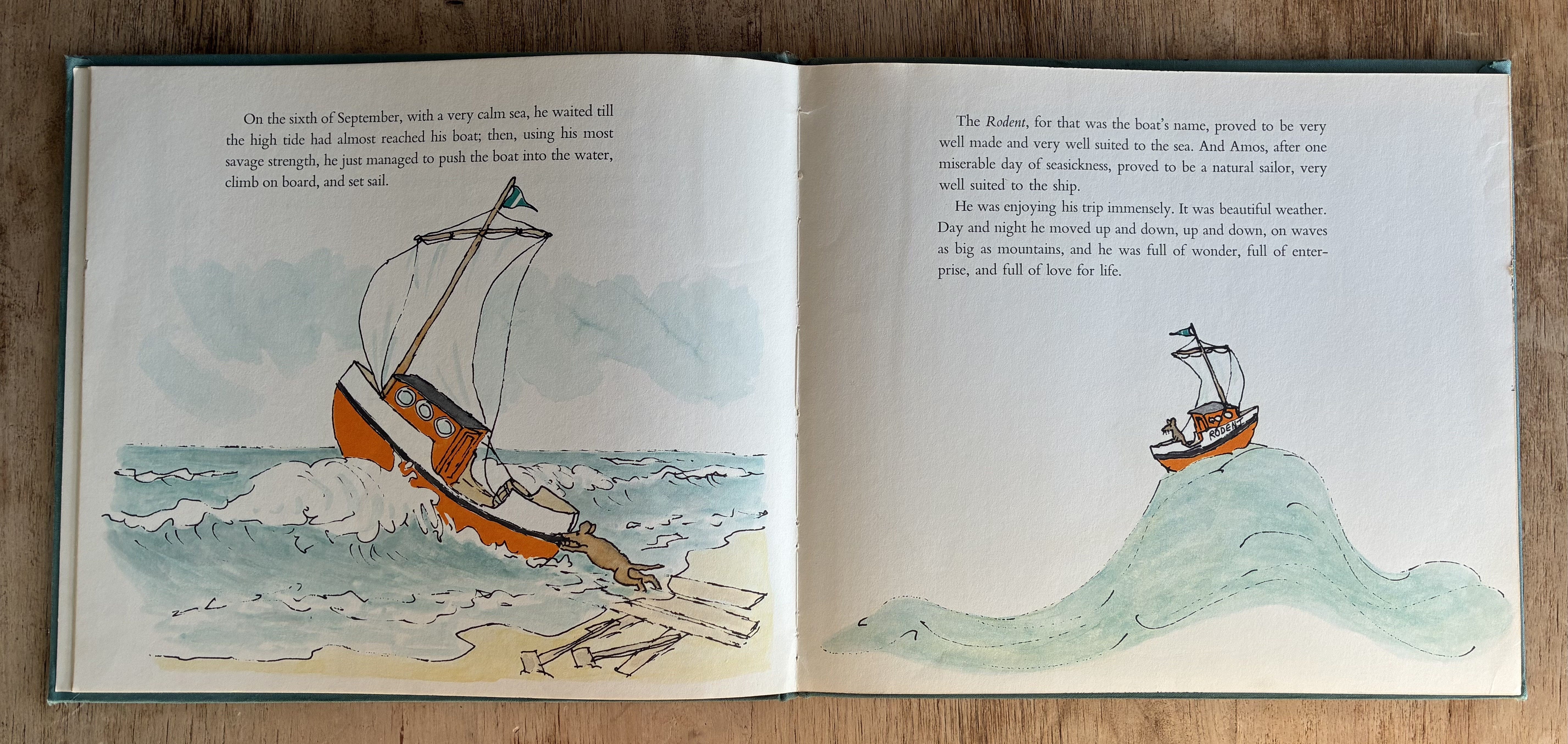 In William Steig’s Amos & Boris, the story introduces us to a mouse, Amos, who loves the ocean and wants to travel on it. He gets to work making a boat for himself, and the book takes us through, step by cute technical step, how he gathers the necessary supplies and builds it, and all the things he pleasantly loads on board the finished vessel that a mouse might need on a multi-year, life-changing journey at sea.