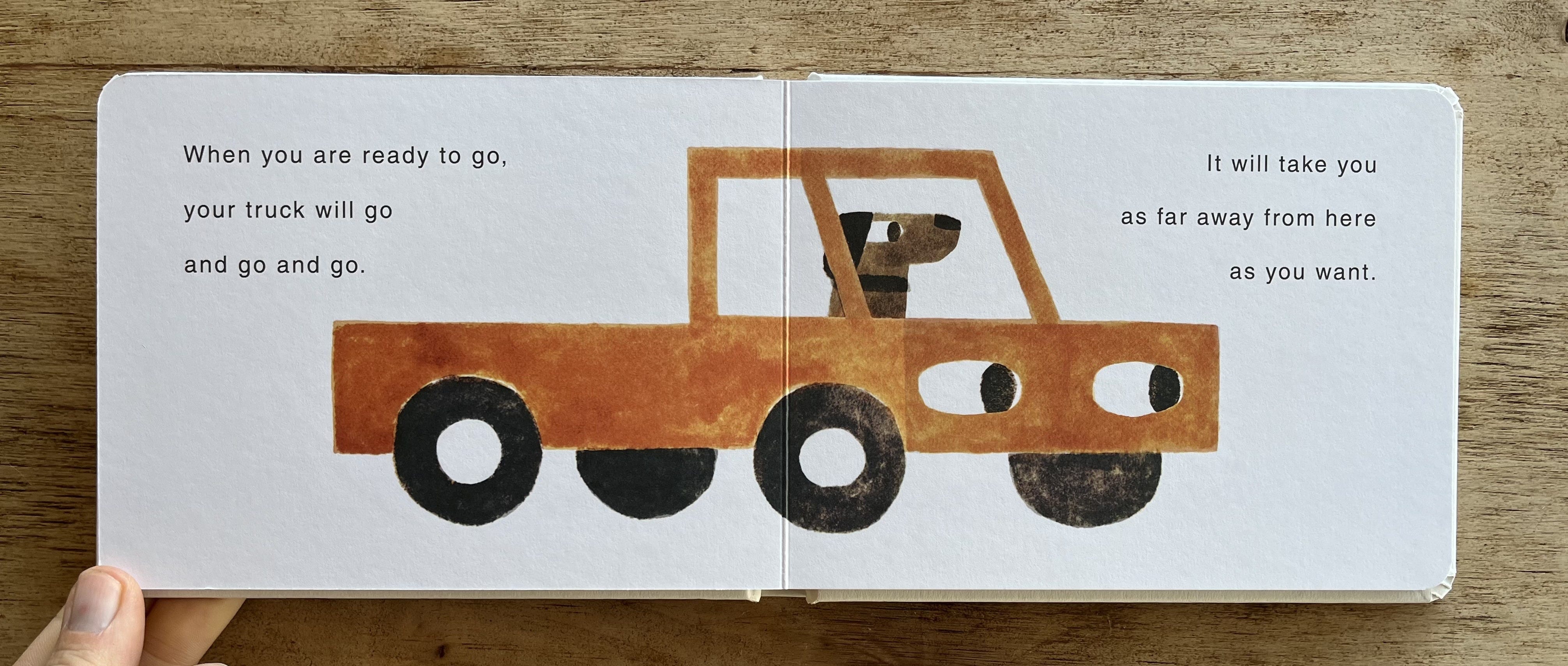 MAC: Right. Although of course you’re not just talking about what trucks do, you’re also talking about a kid going “far away from here,” which is pretty heavily freighted stuff, especially in a book that will often be read by parents to a new child.